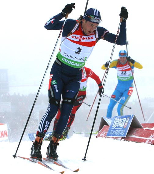 January 10, 2010 (Oberhof, Germany) – The USA’s Tim Burke retained the yellow leader’s bib with excellent shooting 18/20, to finish second at 1:02.9 behind Ole Einar Bjoerndalen (NOR) who gave a sensational performance shooting 19/20 in fog and swirling winds for the victory at Sunday’s IBU World Cup men’s 15km mass start in Oberhof. It was Bjoerndalen’s 92nd World Cup win, a feat that the biathlon-crazy Oberhof fans cheered on in a frenzy.