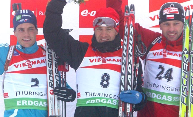 Tim Burke (USA) showed just as much concentration on the shooting range keeping the World Cup leaders jersey for another week. His girlfriend, Andrea Henkel (GER), won the women’s race earlier in the today. “I think Andrea is buying dinner tonight, since she beat me and won more prize money,” quipped Burke at the post-race press conference. Tomasz Sikora (POL) made it to the podium to claim 3rd, for the first time in many weeks, despite missing three shots, two in the final stage.