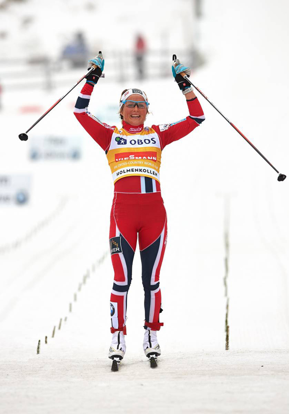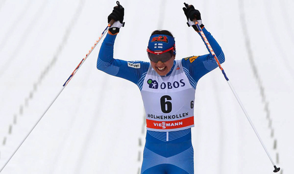 According to FIS it was Bjoergen’s 100th podium and 66th career World Cup win. Her previous Holmenkollen 30km victories include 2005, 2010, and 2012.
