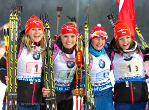 January 14, 2015 (Ruhpolding, Germany) – The Czech Republic was unstoppable topping the women’s 4x6km relay podium again this time in Ruhpolding despite slow, snowy conditions using only 9 spare rounds. Belarus took home the silver at 1:13.3 behind using six spare rounds with Germany settling for third with seven spare rounds.