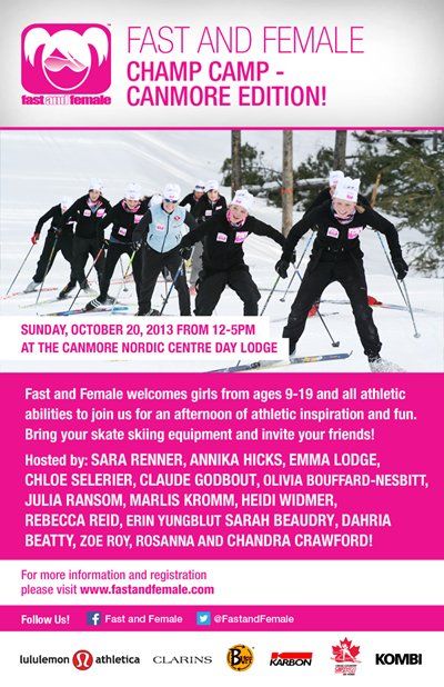 October 09, 2013 (Canmore, AB) – On October 20th, Fast and Female is hosting a “Champ Camp” event taking place on Frozen Thunder at the Canmore Nordic Centre to celebrate the start of the ski season. Olympic medallists, Chandra Crawford and Sara Renner, along with local National Training Centre skiers and biathletes, will host the event, which will include cross-country ski and biathlon activity stations, an inspirational talk, and a yoga and dance session. The event hopes to attract over 100 girls aged 9 to 19.