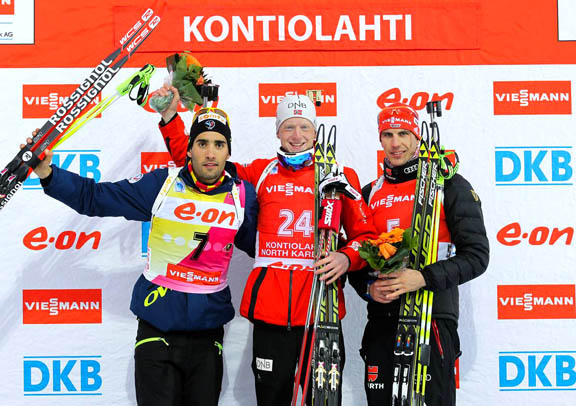 Johannes Thingnes Boe (NOR) [P] Nordic FocusWorld Cup leader Martin Fourcade (FRA) was second, also shooting clean, at 7.1s behind in a fierce battle with Germany’s Arnd Peiffer who missed one target, as he settled for third only 0.1s behind Fourcade.