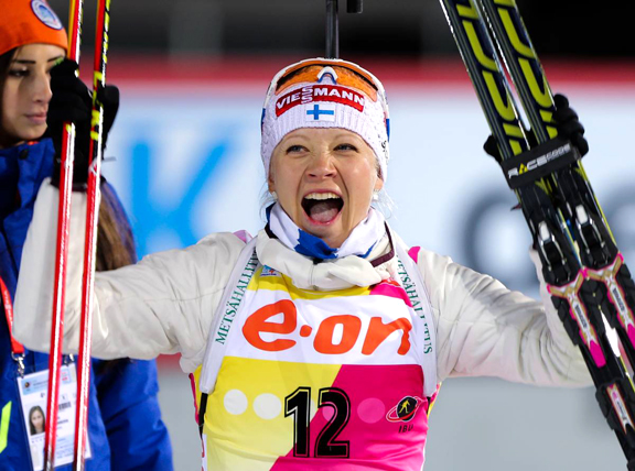 March 15, 2014 (Kontiolahti, Finland) – American Susan Dunklee posted a strong eighth-place finish in today’s 7.5km sprint in Kontiolahti with one penalty at 35.7 seconds behind winner and local hero, Kaisa Makarainen, also with one penalty and a final time of 20:53.6. The Finnish star is on a roll with back-to-back victories.